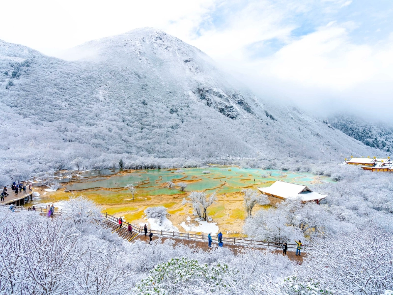 黄龍では、1 月と 2 月の真冬の月が提供する静かで魔法のような体験がゲストを魅了します。雪と氷は風景を完全に変え、まだ凍った池だけが壊れて完全な白いキャンバスを作り出します。冬になると、鉱床は新鮮な品質を獲得します。氷の形は、すでに素晴らしい風景にさらに深みを与えます。熱地帯の周囲では、低温により暖かい水域から蒸気が急激に上昇するという異常な現象が発生します。特に黄金の時間帯には、太陽光線が雪や氷と相互作用するため、冬の光の状態が素晴らしい写真撮影のチャンスをもたらします。この時期は訪問者が少ないため、黄龍の雄大な冬の景色を一人で眺めることができます。凍った地形と流れる水の並置によって生み出されるダイナミックな視覚体験は、冬の自然の力強さと美しさを完璧に捉えています。