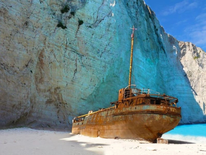 この難破船は「MVパナギオティス号」と呼ばれ、かつてタバコやワイン、さらには売春婦などの密輸品を運んでいたとされる船です。その後、嵐の影響でこの場所に打ち上げられ、今では錆びついた船体が白い砂浜に静かに佇んでいます。この船の存在が、ビーチに独特のドラマチックな雰囲気を与え、訪れる人々に過去の物語を想像させる特別な魅力を生み出しています。