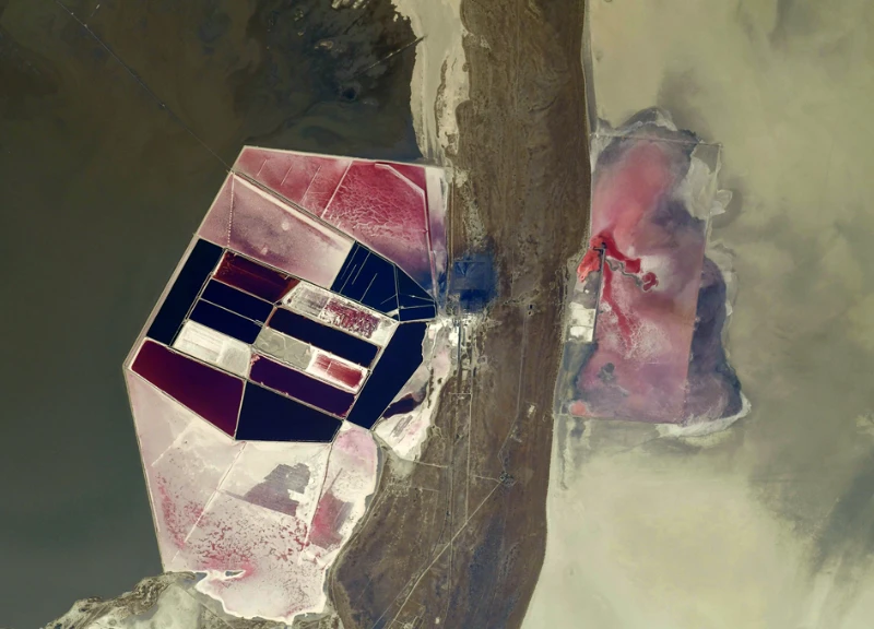 この上空からの写真で目を引くのは、真ん中に見える塩田の景色です。その蓋の外された大きな白い塩田が、まるでアイシャドウのパレットそのものを思わせるような印象的な景色となっています。塩田の周りには細かな水路が走り、塩の結晶が析出するための適度な水分を供給しています。この地域の塩田は恐らく乾燥した内陸部にできた天日製塩場で、人工的に作られた構造物なのでしょう。日射しの強い場所を選び、海水を張り潮風に当てて天日で干上がらせることで、最終的に塩の結晶を析出させる方法です。淡い灰色と真っ白の対比が印象的ですが、よく見ると塩田の周囲に集落が点在していることがわかります。人間の知恵と自然の営みとが巧みに組み合わされ、経済活動に結びついていることが見て取れます。一見人工的でありながら、実はこうした塩田の存在自体が自然の恵みによるものだと言えるでしょう。
