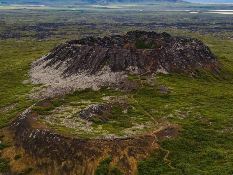 観光客に異質な火山の風景の見事なパノラマを提供するエルドボー クレーター ビューポイントは、この地域で最も美しい場所です。近くの溶岩原から鋭くそびえ立つこのクレーターは、アイスランドの火山の過去を記念する対称的な形を正確に作り上げました。クレーターの端近くに戦略的に配置された展望台からは、広大な溶岩原、遠くの山々、晴れた日のきらめく大西洋の 360 度のパノラマが楽しめます。敷地内にはよく整備されたハイキング コースが火口の縁を取り囲んでいるため、ゲストはこの地質学的驚異をさまざまな角度から楽しむことができます。写真では、黒い火山岩とそこに生えている鮮やかな苔が大きな視覚的インパクトを与えています。影が近くの溶岩原の劇的な輪郭と質感を強調し、ローアングルライトは日没時に景色を金色のディスプレイに変えます。