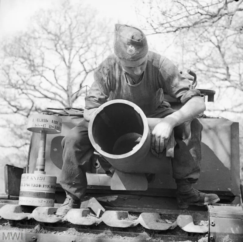 チャーチルAVRE(装甲工兵車両)の主兵装は、直径29センチのPetardプラグ迫撃砲です。この迫撃砲は、非常に特徴的な武器で、重量約40ポンド(約18キログラム)の爆薬を詰めた弾薬を発射することができます。この弾薬は、その形状や威力から「飛行ゴミ箱」という異名で呼ばれていました。