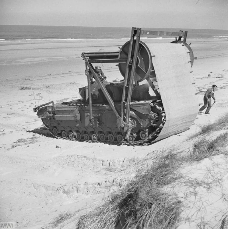 このカーペットは、地面に敷設されることで、ビーチや泥濘地などの困難な地形を安定化させ、重い装甲車両や工兵機材が沈み込むことなく移動できるように設計されています。チャーチルAVREは、このカーペットを車両に搭載して運搬し、必要な場所に展開することで迅速に通行路を確保します。これにより、戦場における進軍速度が向上し、作戦の成功率が高まります。
