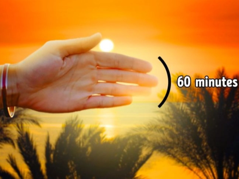 夕暮れまでの残り時間を簡単に知る方法として、手を使った伝統的な測定方法があります。まず、腕をまっすぐ前に伸ばし、手のひらを内側に向けてください。そして、人差し指を太陽の下に置き、太陽がちょうど人差し指の上に「横たわる」ように調整します。このとき、指は揃えたままにしてください。