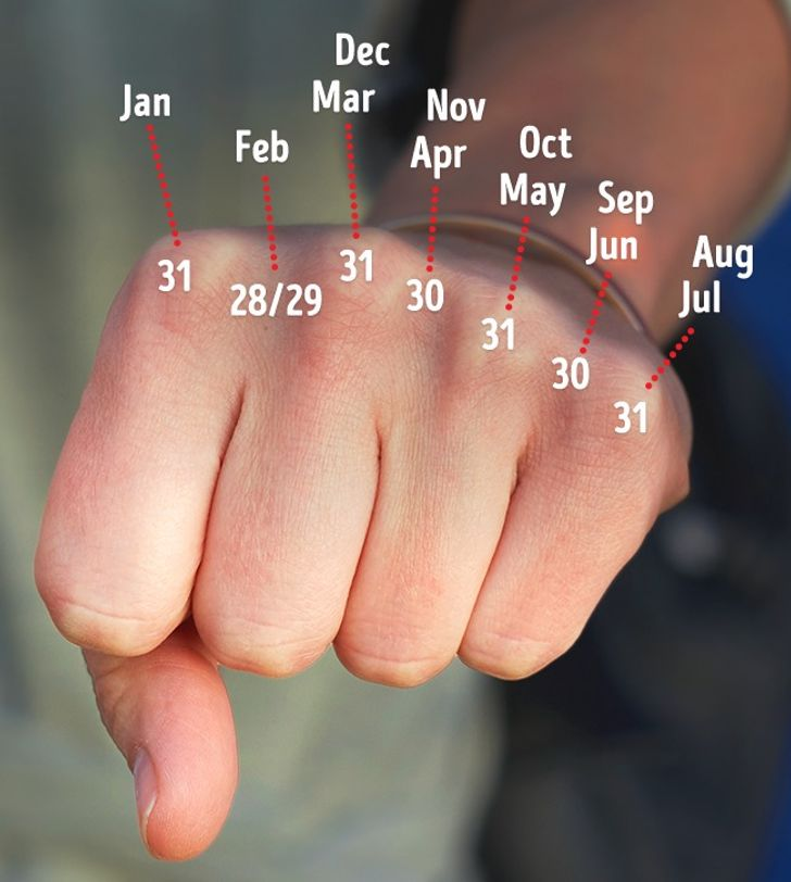1年の各月の日数を簡単に覚える方法として、手の拳を使った方法があります。この方法では、拳を握ったときにできる関節(ナックル)とその間のくぼみを利用します。まず、片手を握りしめて拳を作り、指の付け根にできる関節とその間のくぼみを順番に数えていきます。
