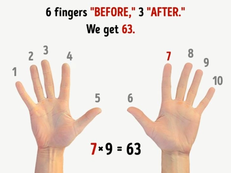これらのトリックは学校で習いましたが、今でも役に立ちます 指をまっすぐに伸ばし、手のひらを下に向けてテーブルの上に手を置き、9 を掛けます。次に、9 を掛けたい量に対応する指を曲げます。「前」の指は 10 を表し、「前」の指は 10 を表します。「後」の指、単位。たとえば、7 × 9 を掛けながら 7 番目の指を曲げます。「前」の指は 6 本、「後」の指は 3 本のままです。解は79×63です。 Page 1 Page 2 Page 3 Page 4 Page 5 Page 6 Page 7 Page 8 Page 9 Page 10