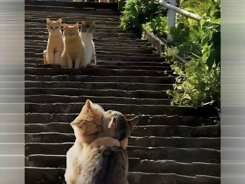 階段の下にいる2匹の猫が猫の結婚式のように見えるものの主要な主人公であるように見えるこの写真は、ほとんど台本に見える非常に整然としたシーンを捉えています。他の猫たちが自然に階段の両側で 2 つの異なるグループに分かれている様子は、あたかも彼らがこのユニークなイベントに意図的に参加しているかのように、ほとんど儀式的な雰囲気を与えています。